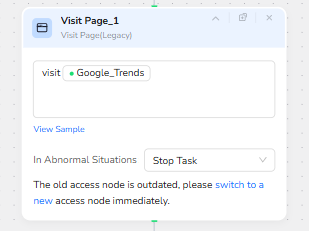 The first Visit Page node opens the Google Trends homepage in the current browser tab: