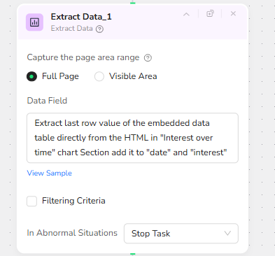 Once the Google Trends page is loaded, the Extract Data node is used to read the embedded data behind the “Interest over time” chart. The node is configured to scan the Full Page and contains an instruction like:
