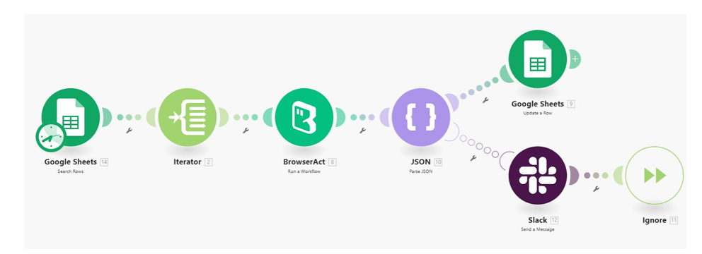 The Make.com scenario orchestrates the full batch job: it reads a list of keywords from Google Sheets, invokes the BrowserAct workflow for each row, parses the JSON output, and updates the sheet with the latest trend information. Optional Slack notifications can alert the team when something goes wrong.